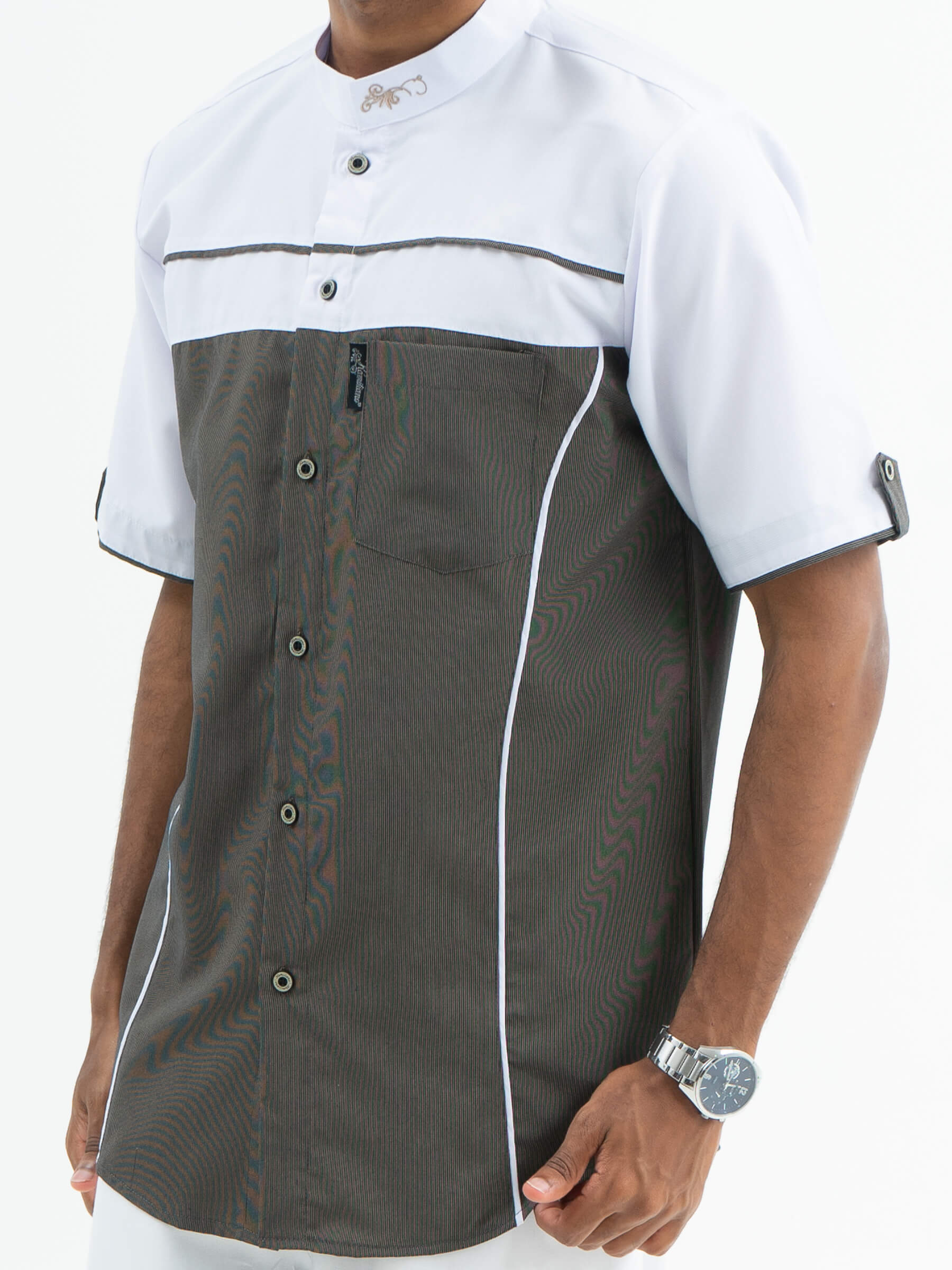 Warna sekunder yang elegan terletak pada bagian pundak depan dan belakang, kerah, hingga lengan. Psikologi terlibat di sini, menciptakan harmoni antara tradisi dan modernitas. Ini adalah pemilihan warna yang mengundang pemakai untuk mengeksplorasi keanggunan dalam keunikan setiap elemen.
